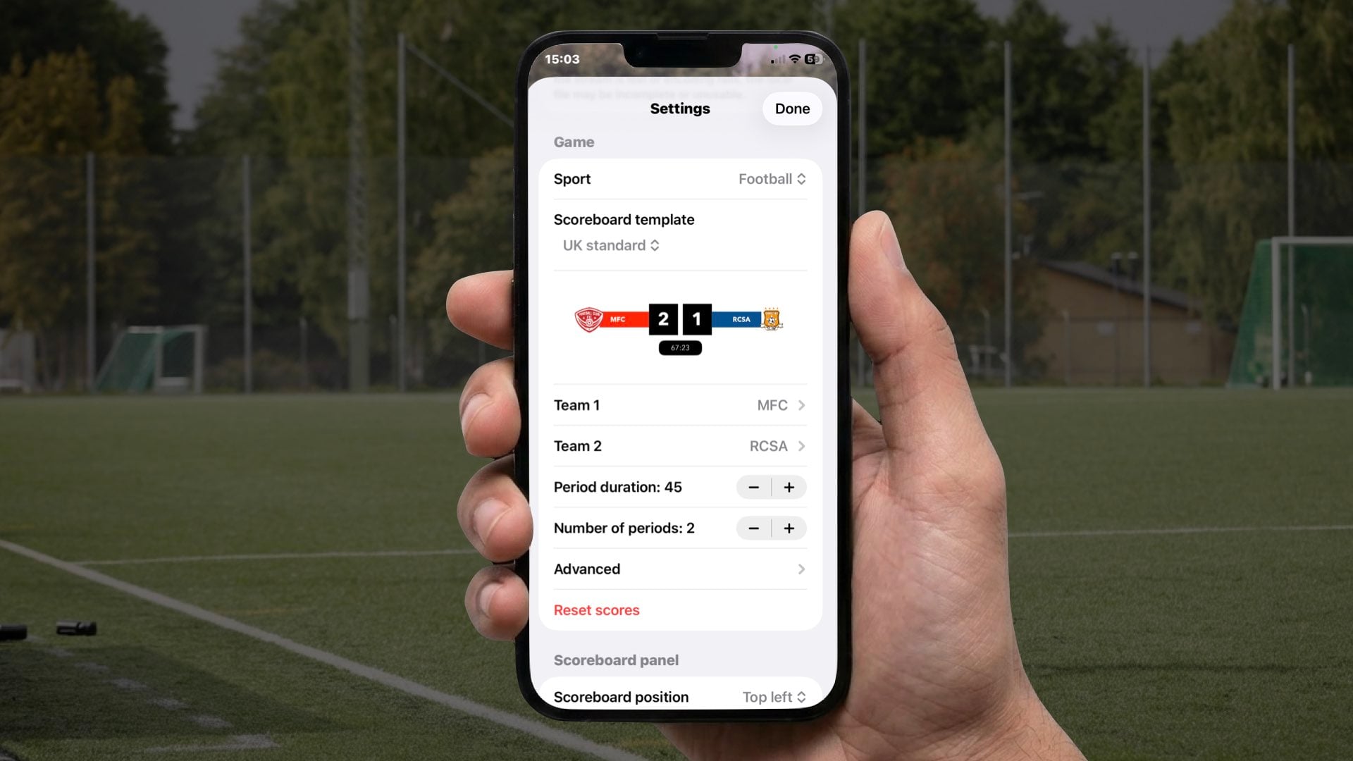 Customize your scoreboard in seconds (add team names, logos, colors).